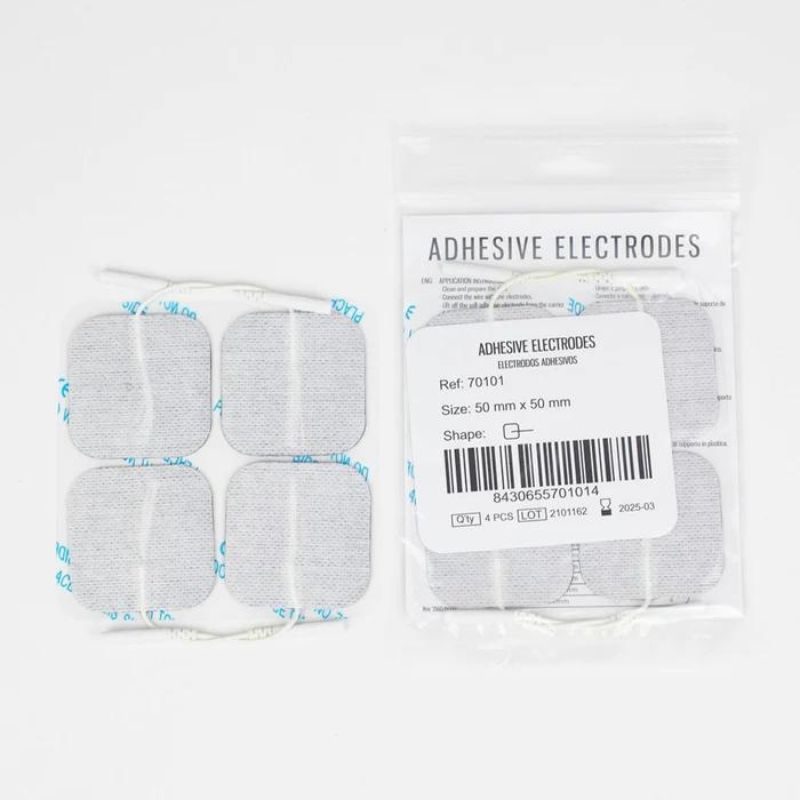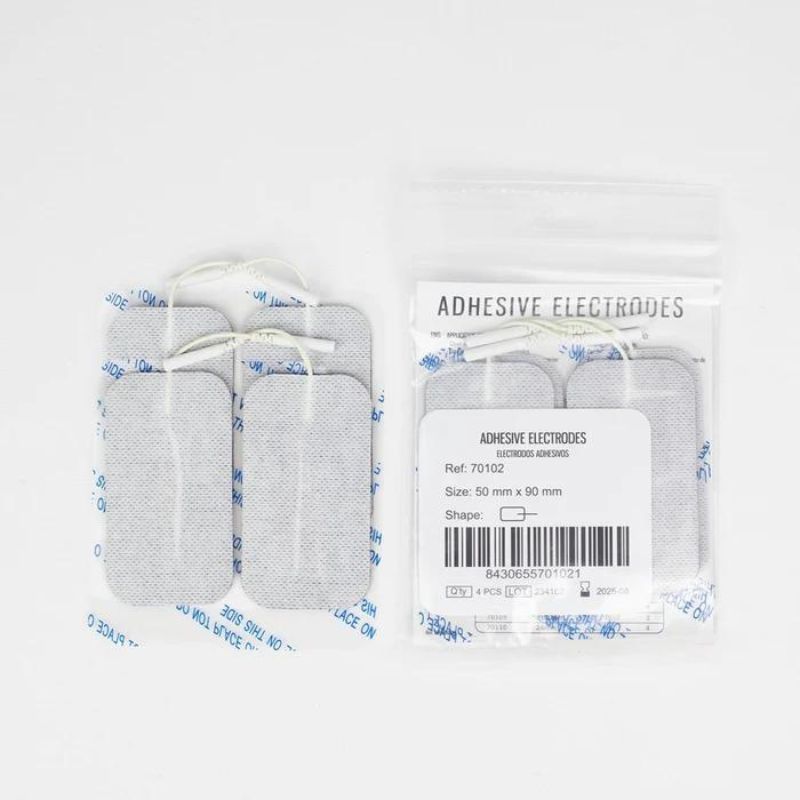 Electrodos autoadhesivos desechables y pregelados, empaquetados en juegos de 4 unidades, con conexión universal tipo banana de 2mm.