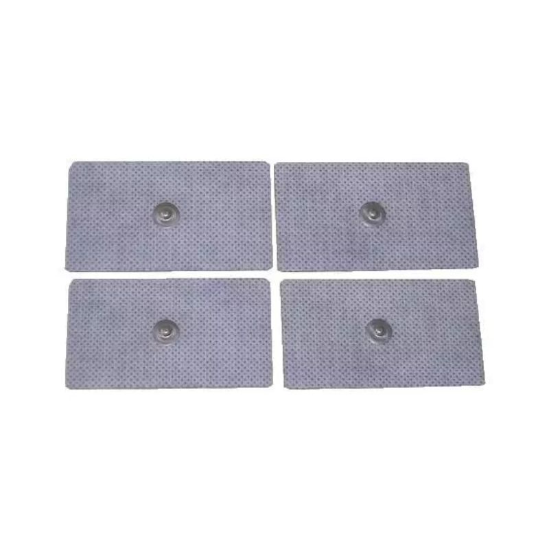 Electrodos adhesivos con conexión de botón “clip”. Compatible con todos los electroestimuladores con fijación de botón. Juego de 4 electrodos autoadhesivos y desechables.