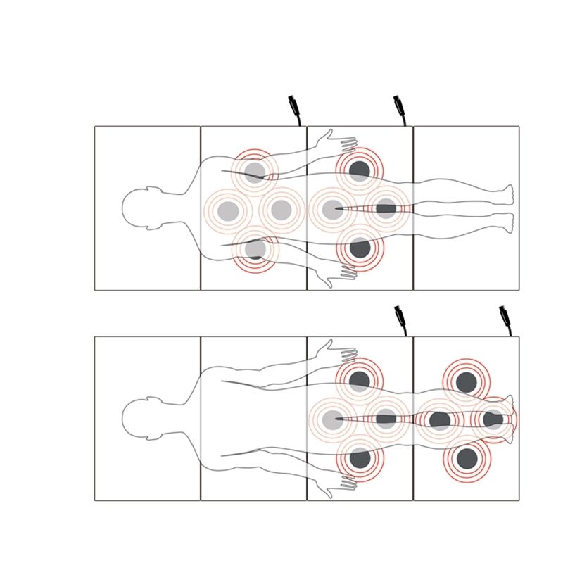 El colchón total body 200 está compuesto de 2 secciones activas que contienen un total de 8 solenoides y 2 secciones neutrales sin solenoides.